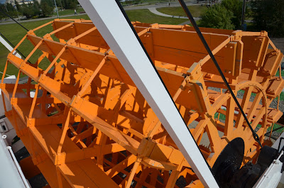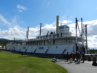 Today we went with the caravan to visit the SS Klondike. This sternwheeler is now permanently dry docked on the banks of the Yukon River in downtown Whitehorse. This sternwheeler travelled to and from Dawson City during the 30's & 40's carrying freight and supplies to remote areas of the Yukon before the construction of highways. The trip from Whitehorse took 2 1/2 days with the current of the Yukon River. The return trip against the current took 5 days. It is hard to imagine how hard the people in those days worked. It was a flat bottom vessel with no keel. Unloaded it would be 24" into the water and loaded with 300,000 lbs of freight, it would be 40" into the water. It would burn 1 1/2 cords of wood an hour to produce the steam to power the vessel. Since there wasn't enough room to carry all the wood needed they would have to stop along the river at certain places where would stack and reload more wood to continue on.