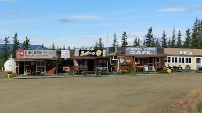 We have arrived at Chicken, Alaska. Chicken is the first town we entered after reaching Alaska. It has a year round population of 5. They have to generate their own electricity here. The town of Chicken has a Cafe, a Liquor store, a barroom and a gift shop....all of these businesses are in a row (like a strip mall). The gift shop, liquor store and bar are all owned by the same person. The person who sold you something in the gift shop will be the same person who sells you a drink in the bar.