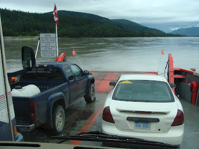VEHICLES BEING LOADED ONTO THE FERRY TO CROSS THE YUKON RIVER
