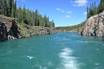 Today we went with the caravan to visit the SS Klondike. This sternwheeler is now permanently dry docked on the banks of the Yukon River in downtown Whitehorse. This sternwheeler travelled to and from Dawson City during the 30's & 40's carrying freight and supplies to remote areas of the Yukon before the construction of highways. The trip from Whitehorse took 2 1/2 days with the current of the Yukon River. The return trip against the current took 5 days. It is hard to imagine how hard the people in those days worked. It was a flat bottom vessel with no keel. Unloaded it would be 24" into the water and loaded with 300,000 lbs of freight, it would be 40" into the water. It would burn 1 1/2 cords of wood an hour to produce the steam to power the vessel. Since there wasn't enough room to carry all the wood needed they would have to stop along the river at certain places where would stack and reload more wood to continue on.